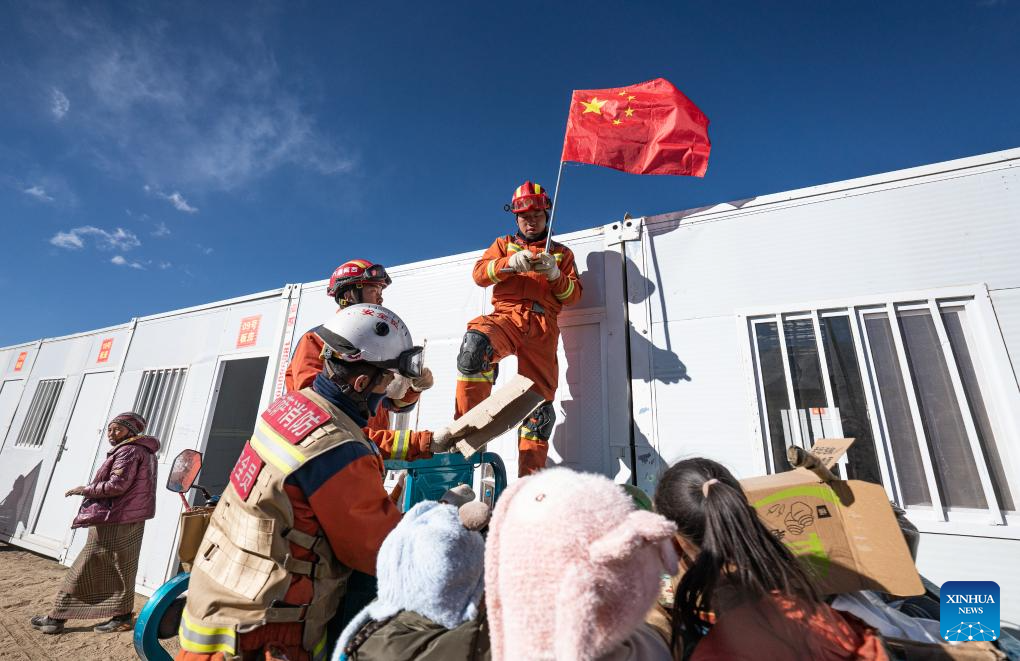 DINGRI, 14 enero, 2025 (Xinhua) -- Imagen del 13 de enero de 2025 de un bombero preparándose para colocar una bandera nacional en un refugio improvisado, en la aldea de Yejiang del distrito de Dingri, en Xigaze, en la región autónoma de Xizang, en el suroeste de China. El 7 de enero, un terremoto de magnitud 6,8 sacudió Dingri, hogar del campamento base norte del pico más alto del mundo, el monte Qomolangma. Actualmente, las autoridades locales y los equipos de rescate están ocupados levantando casas improvisadas, permitiendo a los residentes desplazados trasladarse de las tiendas de campaña a viviendas más resistentes a los terremotos. Hasta las 6 p. m. del 12 de enero, se habían instalado alrededor de 2.198 casas improvisadas en varios sitios de reubicación en Dingri, en un esfuerzo por garantizar un invierno seguro y cálido para todos. A medida que avanzan los trabajos de reasentamiento, también se están realizando esfuerzos de remoción de escombros y rescate de propiedades. (Xinhua/Tenzin Nyida)