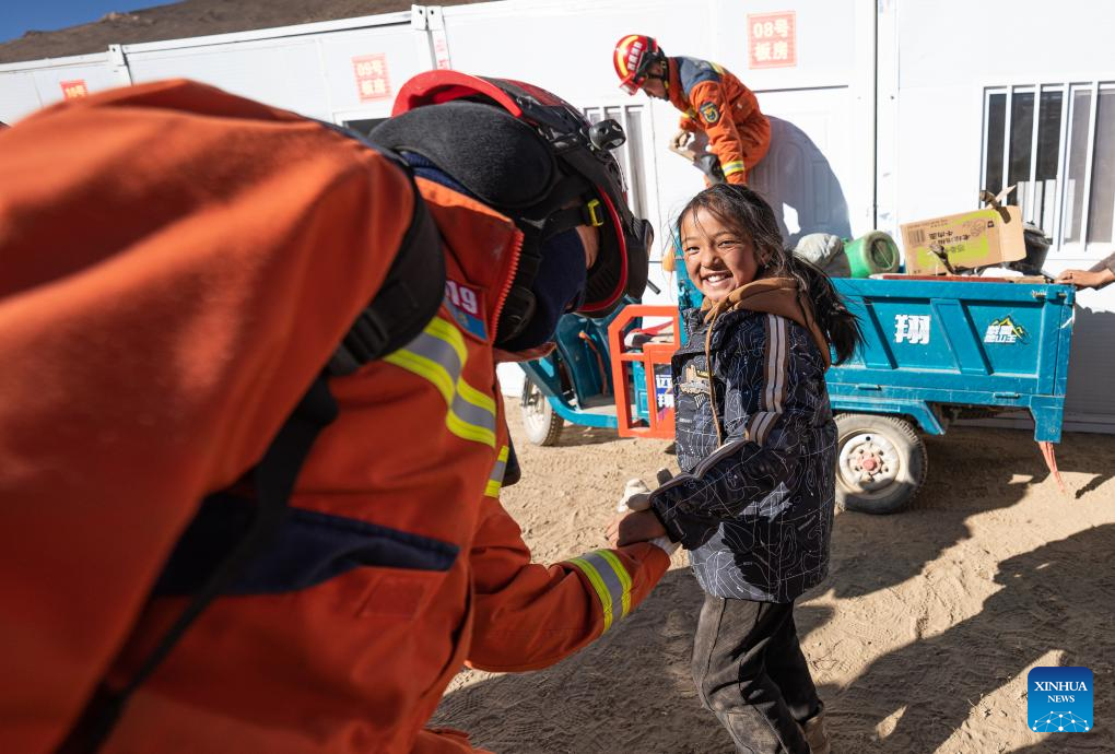 DINGRI, 14 enero, 2025 (Xinhua) -- Imagen del 13 de enero de 2025 de una niña jugando al pulso con un bombero, en la aldea de Yejiang del distrito de Dingri, en Xigaze, en la región autónoma de Xizang, en el suroeste de China. El 7 de enero, un terremoto de magnitud 6,8 sacudió Dingri, hogar del campamento base norte del pico más alto del mundo, el monte Qomolangma. Actualmente, las autoridades locales y los equipos de rescate están ocupados levantando casas improvisadas, permitiendo a los residentes desplazados trasladarse de las tiendas de campaña a viviendas más resistentes a los terremotos. Hasta las 6 p. m. del 12 de enero, se habían instalado alrededor de 2.198 casas improvisadas en varios sitios de reubicación en Dingri, en un esfuerzo por garantizar un invierno seguro y cálido para todos. A medida que avanzan los trabajos de reasentamiento, también se están realizando esfuerzos de remoción de escombros y rescate de propiedades. (Xinhua/Tenzin Nyida)
