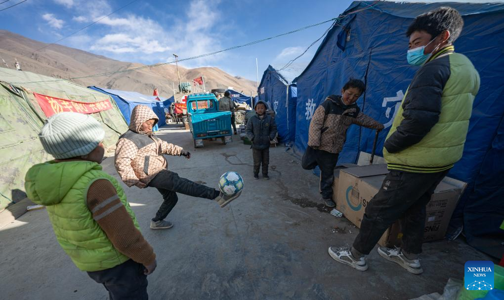 DINGRI, 14 enero, 2025 (Xinhua) -- Imagen del 13 de enero de 2025 de niños jugando fútbol en un sitio de reasentamiento para personas afectadas por el terremoto, en la aldea de Gurum, en el poblado de Chamco del distrito de Dingri, en Xigaze, en la región autónoma de Xizang, en el suroeste de China. El 7 de enero, un terremoto de magnitud 6,8 sacudió Dingri, hogar del campamento base norte del pico más alto del mundo, el monte Qomolangma. Actualmente, las autoridades locales y los equipos de rescate están ocupados levantando casas improvisadas, permitiendo a los residentes desplazados trasladarse de las tiendas de campaña a viviendas más resistentes a los terremotos. Hasta las 6 p. m. del 12 de enero, se habían instalado alrededor de 2.198 casas improvisadas en varios sitios de reubicación en Dingri, en un esfuerzo por garantizar un invierno seguro y cálido para todos. A medida que avanzan los trabajos de reasentamiento, también se están realizando esfuerzos de remoción de escombros y rescate de propiedades. (Xinhua/Tenzin Nyida)