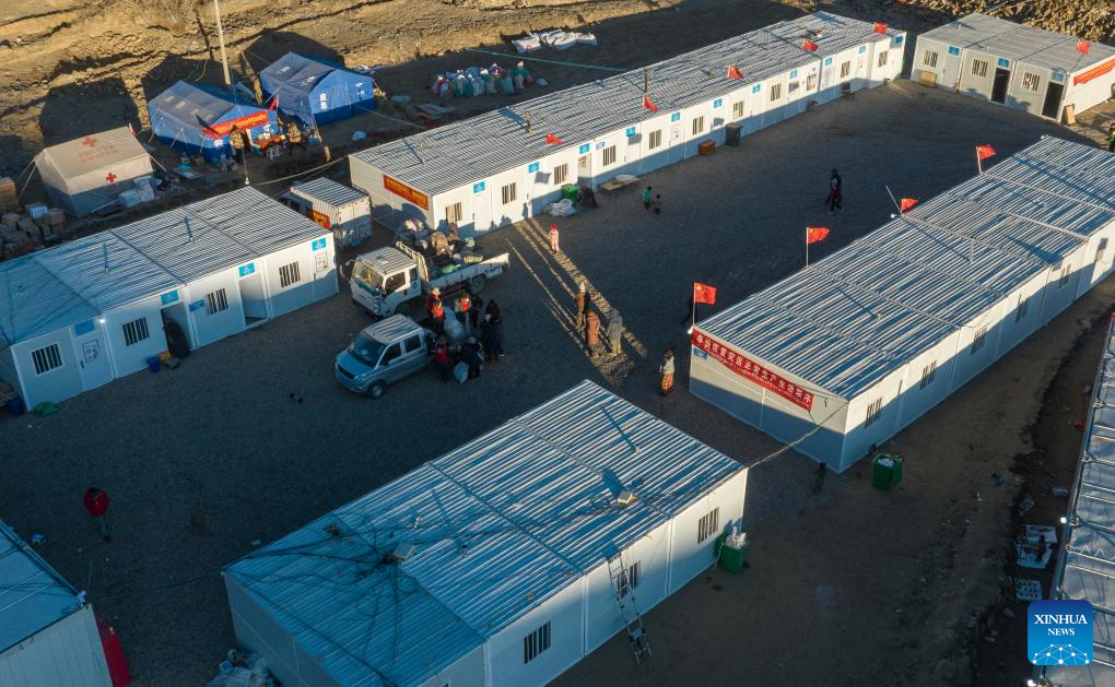DINGRI, 14 enero, 2025 (Xinhua) -- Vista aérea tomada con un dron el 13 de enero de 2025 de residentes afectados por el terremoto trasladándose a refugios improvisados, en la aldea de Gurum, en el poblado de Chamco del distrito de Dingri, en Xigaze, en la región autónoma de Xizang, en el suroeste de China. El 7 de enero, un terremoto de magnitud 6,8 sacudió Dingri, hogar del campamento base norte del pico más alto del mundo, el monte Qomolangma. Actualmente, las autoridades locales y los equipos de rescate están ocupados levantando casas improvisadas, permitiendo a los residentes desplazados trasladarse de las tiendas de campaña a viviendas más resistentes a los terremotos. Hasta las 6 p. m. del 12 de enero, se habían instalado alrededor de 2.198 casas improvisadas en varios sitios de reubicación en Dingri, en un esfuerzo por garantizar un invierno seguro y cálido para todos. A medida que avanzan los trabajos de reasentamiento, también se están realizando esfuerzos de remoción de escombros y rescate de propiedades. (Xinhua/Tenzin Nyida)