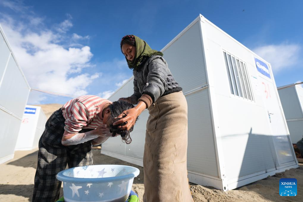 DINGRI, 14 enero, 2025 (Xinhua) -- Imagen del 13 de enero de 2025 de una residente afectada por el terremoto ayudando a su hija a lavarse el cabello, en la aldea de Gadan del poblado de Chamco, en el distrito de Dingri, en Xigaze, en la región autónoma de Xizang, en el suroeste de China. El 7 de enero, un terremoto de magnitud 6,8 sacudió Dingri, hogar del campamento base norte del pico más alto del mundo, el monte Qomolangma. Actualmente, las autoridades locales y los equipos de rescate están ocupados levantando casas improvisadas, permitiendo a los residentes desplazados trasladarse de las tiendas de campaña a viviendas más resistentes a los terremotos. Hasta las 6 p. m. del 12 de enero, se habían instalado alrededor de 2.198 casas improvisadas en varios sitios de reubicación en Dingri, en un esfuerzo por garantizar un invierno seguro y cálido para todos. A medida que avanzan los trabajos de reasentamiento, también se están realizando esfuerzos de remoción de escombros y rescate de propiedades. (Xinhua/Tenzin Nyida)