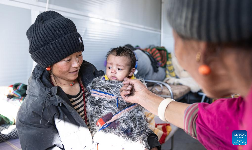 DINGRI, 14 enero, 2025 (Xinhua) -- Imagen del 13 de enero de 2025 de una residente mayor interactuando con su nieto dentro de un refugio improvisado, en la aldea de Gadan del poblado de Chamco, en el distrito de Dingri, en Xigaze, en la región autónoma de Xizang, en el suroeste de China. El 7 de enero, un terremoto de magnitud 6,8 sacudió Dingri, hogar del campamento base norte del pico más alto del mundo, el monte Qomolangma. Actualmente, las autoridades locales y los equipos de rescate están ocupados levantando casas improvisadas, permitiendo a los residentes desplazados trasladarse de las tiendas de campaña a viviendas más resistentes a los terremotos. Hasta las 6 p. m. del 12 de enero, se habían instalado alrededor de 2.198 casas improvisadas en varios sitios de reubicación en Dingri, en un esfuerzo por garantizar un invierno seguro y cálido para todos. A medida que avanzan los trabajos de reasentamiento, también se están realizando esfuerzos de remoción de escombros y rescate de propiedades. (Xinhua/Tenzin Nyida)