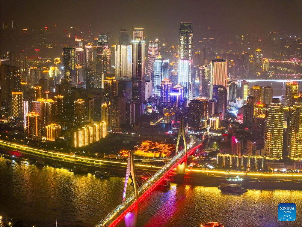 CHONGQING, 2 marzo, 2025 (Xinhua) -- Vista aérea tomada por un dron el 28 de febrero de 2025 de una vista nocturna del centro de la ciudad de Chongqing, en el suroeste de China. (Xinhua/Wang Quanchao)