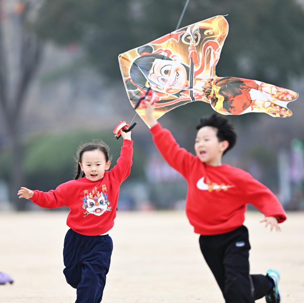 TENGZHOU, 2 marzo, 2025 (Xinhua) -- Imagen del 1 de marzo de 2025 de niños volando cometas en un parque, en la ciudad de Tengzhou, en la provincia de Shandong, en el este de China. (Xinhua/Li Zhijun)