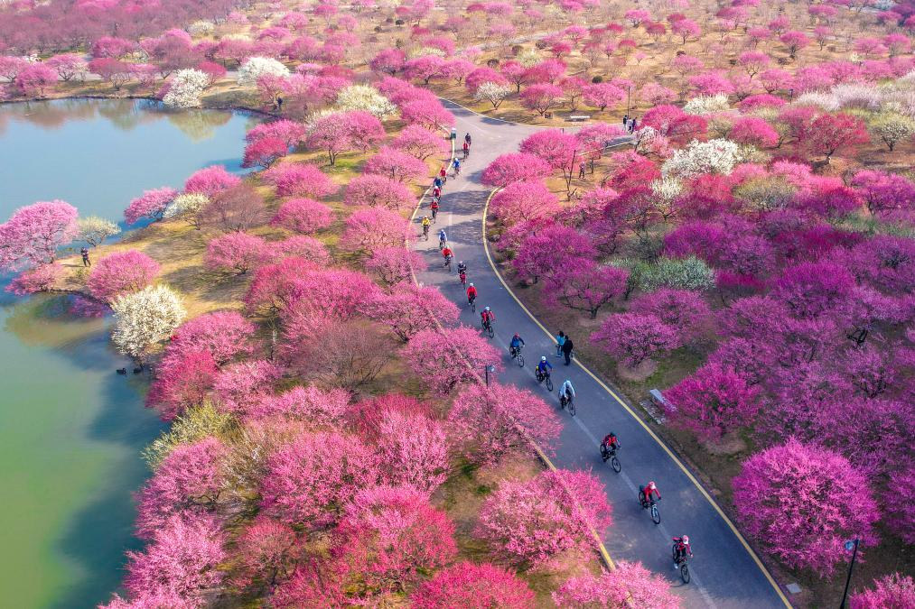 HUZHOU, 2 marzo, 2025 (Xinhua) -- Vista aérea tomada con un dron el 2 de marzo de 2025 de personas paseando en bicicleta entre ciruelos en flor, en el distrito de Changxing, en la ciudad de Huzhou, en la provincia de Zhejiang, en el este de China. (Xinhua/Wu Zheng)