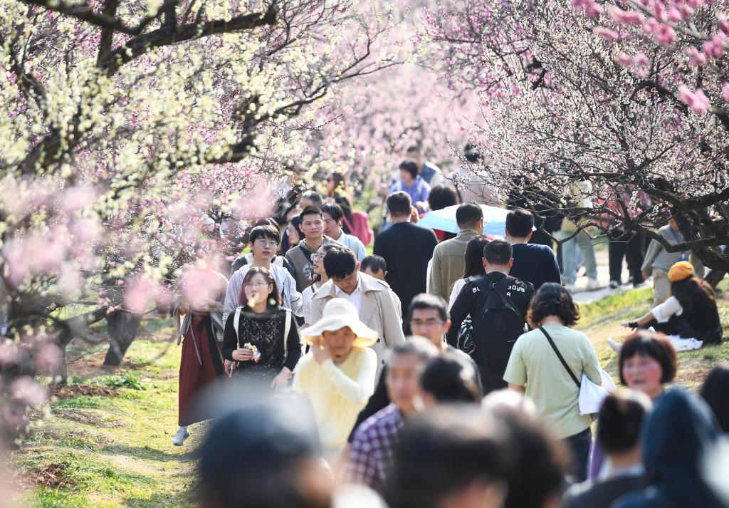 NANJING, 2 marzo, 2025 (Xinhua) -- Imagen del 1 de marzo de 2025 de personas disfrutando de las flores en la montaña Meihua, en Nanjing, en la provincia de Jiangsu, en el este de China. (Xinhua/Yang Suping)