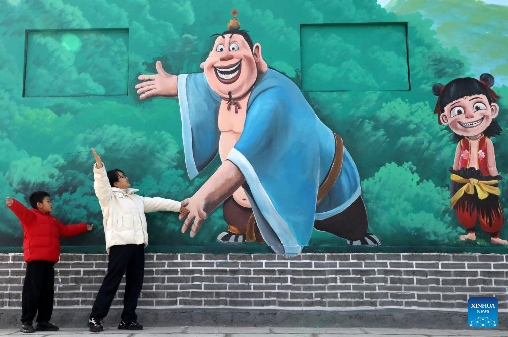 BEIJING, 2 marzo, 2025 (Xinhua) -- Imagen del 1 de marzo de 2025 de una niña posando para fotografías con una pintura mural de la exitosa película animada "Ne Zha 2", en la aldea Dongfeng del distrito de Boxing, en Binzhou, en la provincia de Shandong, en el este de China. (Xinhua/Chen Bin)