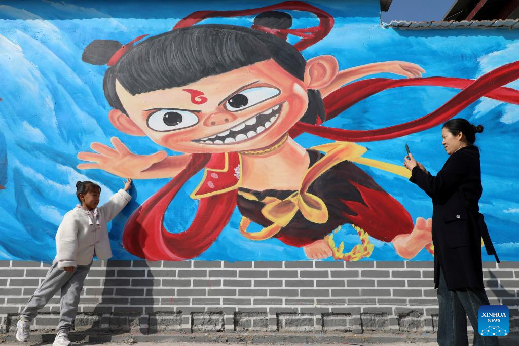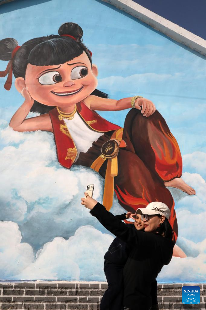 BEIJING, 2 marzo, 2025 (Xinhua) -- Imagen del 1 de marzo de 2025 de turistas posando para fotografías con una pintura mural de la exitosa película animada "Ne Zha 2", en la aldea Dongfeng del distrito de Boxing, en Binzhou, en la provincia de Shandong, en el este de China. (Xinhua/Chen Bin)