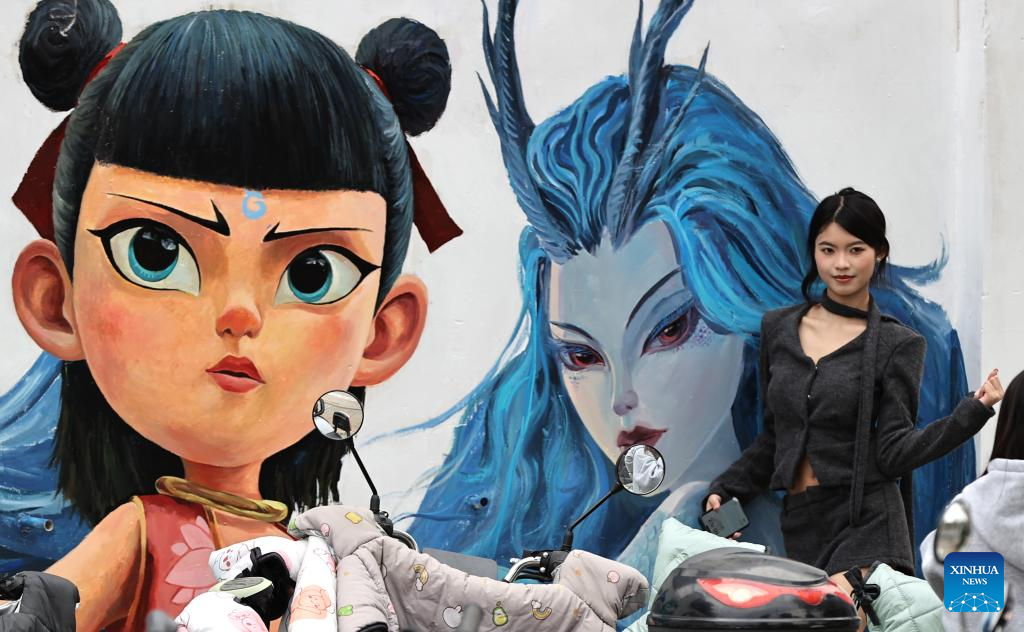 BEIJING, 2 marzo, 2025 (Xinhua) -- Imagen del 1 de marzo de 2025 de una turista posando para fotografías con una pintura mural de la exitosa película animada "Ne Zha 2", en el distrito de Jiangxia de Wuhan, en la provincia de Hubei, en el centro de China. (Xinhua/Zhou Guoqiang)
