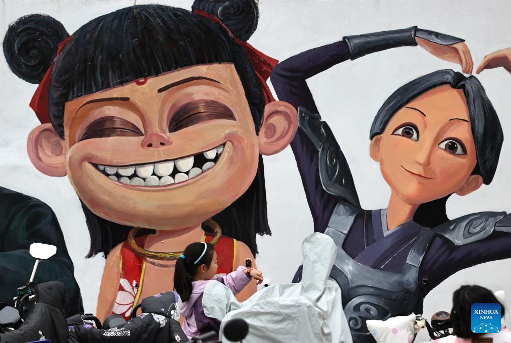 BEIJING, 2 marzo, 2025 (Xinhua) -- Imagen del 1 de marzo de 2025 de una niña tomando fotografías de una pintura mural de la exitosa película animada "Ne Zha 2", en el distrito de Jiangxia de Wuhan, en la provincia de Hubei, en el centro de China. (Xinhua/Zhou Guoqiang)