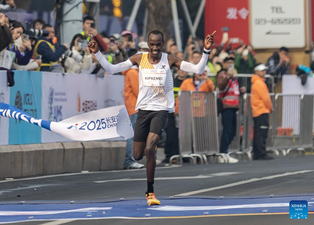 CHONGQING, 2 marzo, 2025 (Xinhua) -- Boaz Kipkemei, de Kenia, cruza la línea de meta para ganar la prueba masculina de maratón durante el Maratón de Chongqing 2025, en la municipalidad de Chongqing, en el suroeste de China, el 2 de marzo de 2025. (Xinhua/Huang Wei)