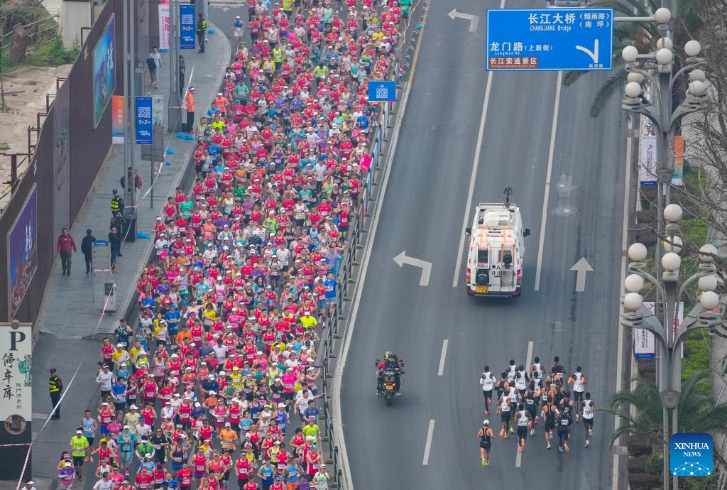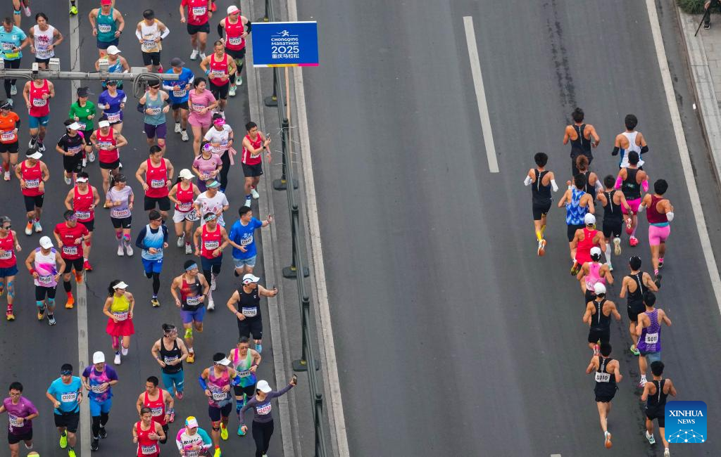 CHONGQING, 2 marzo, 2025 (Xinhua) -- Participantes compiten durante el Maratón de Chongqing 2025, en la municipalidad de Chongqing, en el suroeste de China, el 2 de marzo de 2025. (Xinhua/Liu Chan)