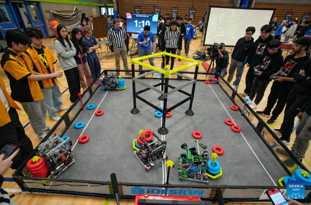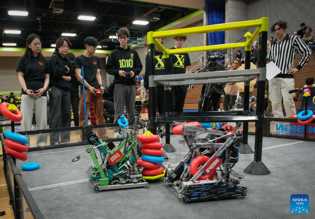 BURNABY, 2 marzo, 2025 (Xinhua) -- Imagen del 1 de marzo de 2025 de concursantes observando sus robots compitiendo en un campo de enfrentamientos durante el Campeonato Regional de Robótica VEX 2025, en Burnaby, Columbia Británica, Canadá. Cientos de estudiantes de preparatoria hicieron equipos para participar en la competencia aquí el sábado, y los ganadores avanzaran en el Campeonato Mundial de Robótica VEX, en Dallas, Estados Unidos, en mayo de 2025. (Xinhua/Liang Sen)
