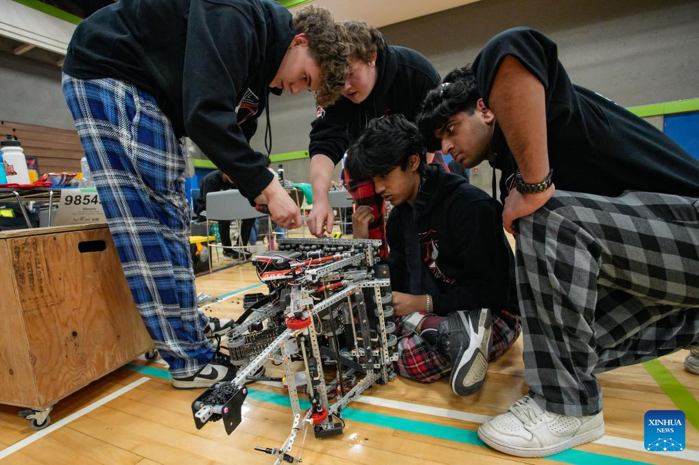 BURNABY, 2 marzo, 2025 (Xinhua) -- Imagen del 1 de marzo de 2025 de concursantes configurando un robot durante el Campeonato Regional de Robótica VEX 2025, en Burnaby, Columbia Británica, Canadá. Cientos de estudiantes de preparatoria hicieron equipos para participar en la competencia aquí el sábado, y los ganadores avanzaran en el Campeonato Mundial de Robótica VEX, en Dallas, Estados Unidos, en mayo de 2025. (Xinhua/Liang Sen)