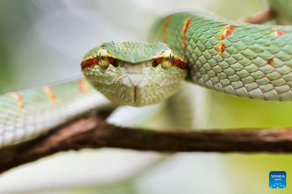 SINGAPUR, 3 marzo, 2025 (Xinhua) -- Imagen del 14 de enero de 2025 de una víbora del templo descansando en una rama en la Reserva Natural de la Cuenca Central de Singapur. El Día Mundial de la Vida Silvestre se celebra anualmente el 3 de marzo. Singapur tiene muchas reservas naturales, brindando hábitats a animales salvajes y plantas. (Xinhua/Then Chih Wey)