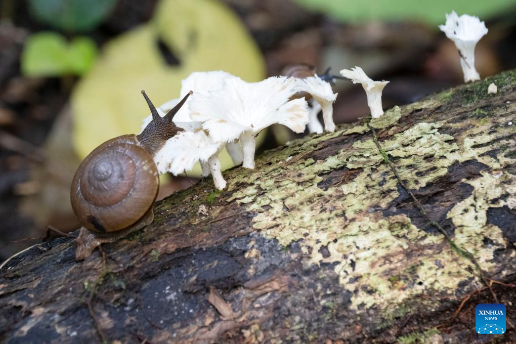 SINGAPUR, 3 marzo, 2025 (Xinhua) -- Imagen del 2 de enero de 2025 de un caracol alimentándose de hongos en la Reserva Natural de la Cuenca Central de Singapur. El Día Mundial de la Vida Silvestre se celebra anualmente el 3 de marzo. Singapur tiene muchas reservas naturales, brindando hábitats a animales salvajes y plantas. (Xinhua/Then Chih Wey)