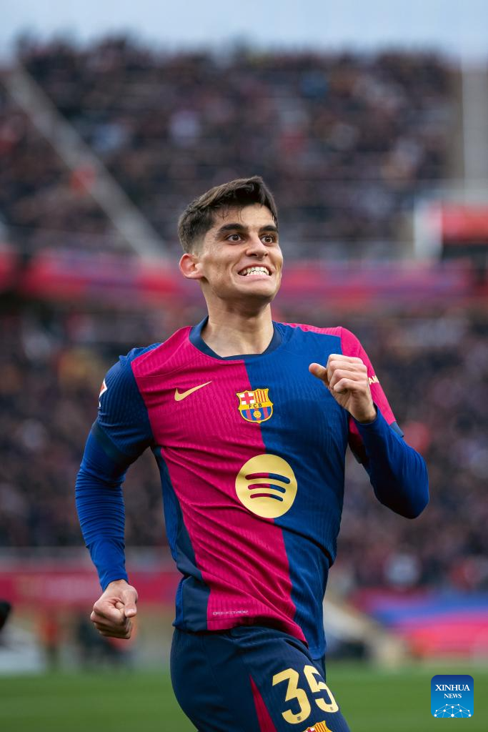 BARCELONA, 3 marzo, 2025 (Xinhua) -- Imagen del 2 de marzo de 2025 de Gerard Martin, de FC Barcelona, festejando su anotación durante el partido de fútbol de LaLiga entre FC Barcelona y Real Sociedad, en el Estadio Olímpico Lluís Companys, en Barcelona, España. (Xinhua/Joan Gosa)
