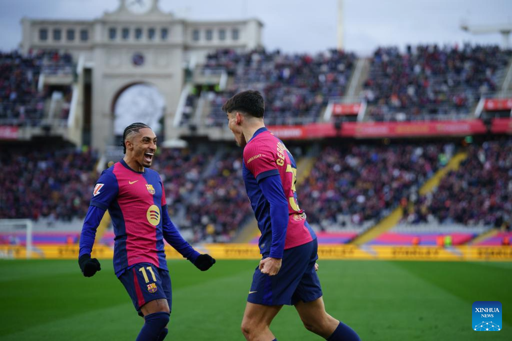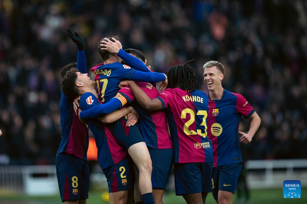 BARCELONA, 3 marzo, 2025 (Xinhua) -- Imagen del 2 de marzo de 2025 de jugadores de FC Barcelona, festejando una anotación durante el partido de fútbol de LaLiga entre FC Barcelona y Real Sociedad, en el Estadio Olímpico Lluís Companys, en Barcelona, España. (Xinhua/Joan Gosa)