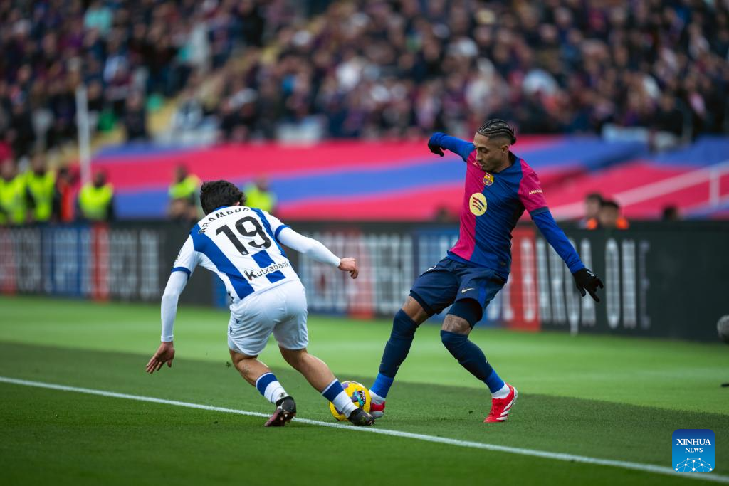 BARCELONA, 3 marzo, 2025 (Xinhua) -- Imagen del 2 de marzo de 2025 de Raphinha (d), de FC Barcelona, disputando el balón con Aramburu, de Real Sociedad, durante el partido de fútbol de LaLiga entre FC Barcelona y Real Sociedad, en el Estadio Olímpico Lluís Companys, en Barcelona, España. (Xinhua/Joan Gosa)