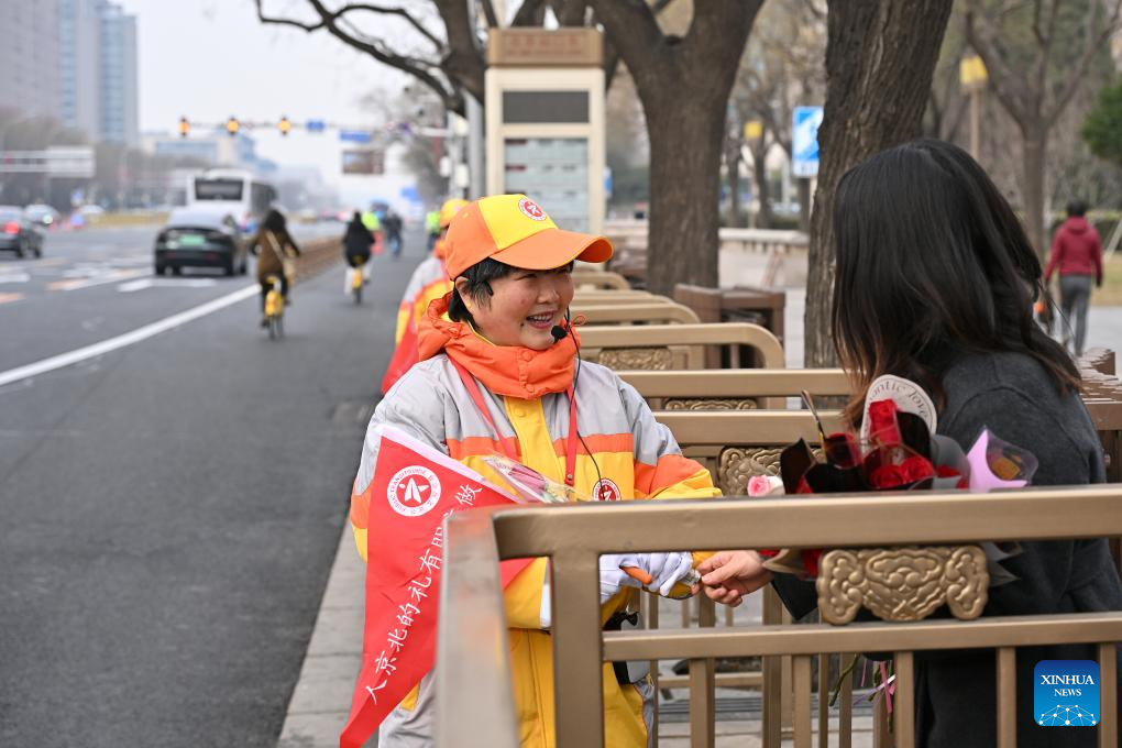 BEIJING, 7 marzo, 2025 (Xinhua) -- Una trabajadora comunitaria regala flores a una voluntaria (i) en una estación de autobuses, en el distrito de Dongcheng, en Beijing, capital de China, el 7 de marzo de 2025. Varias actividades se llevan a cabo en todo el país para conmemorar el Día Internacional de la Mujer. (Xinhua/Li Xin)
