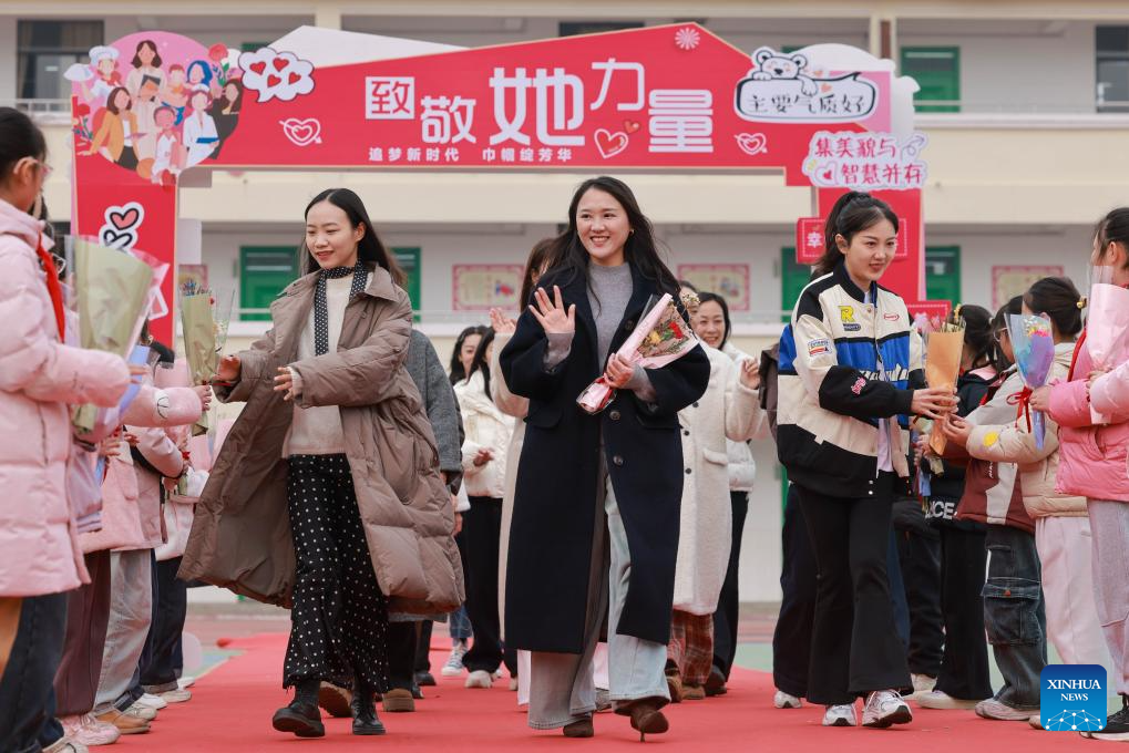 BEIJING, 7 marzo, 2025 (Xinhua) -- Estudiantes regalan flores a profesoras durante un evento para celebrar el Día Internacional de la Mujer en una escuela primaria, en la ciudad de Zaozhuang, en la provincia de Shandong, en el este de China, el 7 de marzo de 2025. Varias actividades se llevan a cabo en todo el país para conmemorar el Día Internacional de la Mujer. (Xinhua/Wang Longfei)