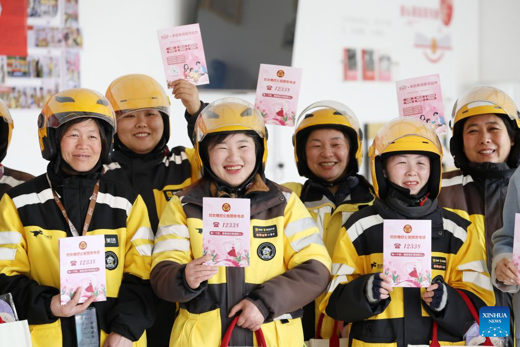 BEIJING, 7 marzo, 2025 (Xinhua) -- Mujeres repartidoras muestran manuales sobre los derechos de las mujeres, en Linyi, en la provincia de Shandong, en el este de China, el 7 de marzo de 2025. Varias actividades se llevan a cabo en todo el país para conmemorar el Día Internacional de la Mujer. (Xinhua/Zhang Chunlei)