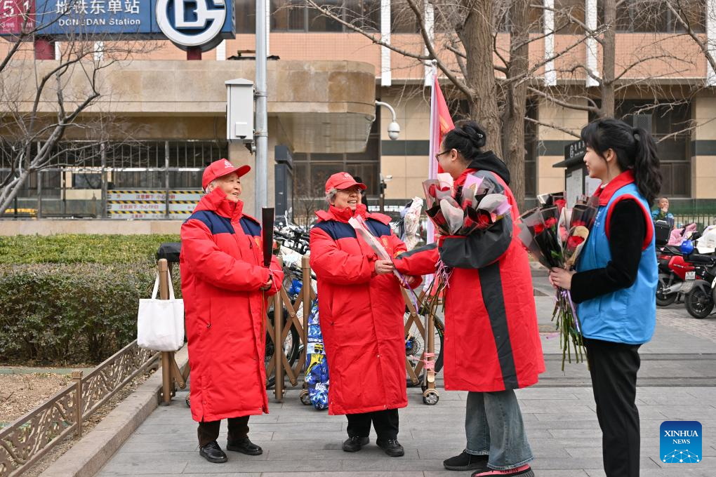 BEIJING, 7 marzo, 2025 (Xinhua) -- Trabajadoras comunitarias regalan flores a voluntarias (i y 2-i) en una estación del metro, en el distrito de Dongcheng, en Beijing, capital de China, el 7 de marzo de 2025. Varias actividades se llevan a cabo en todo el país para conmemorar el Día Internacional de la Mujer. (Xinhua/Li Xin)