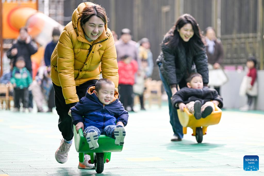 BEIJING, 7 marzo, 2025 (Xinhua) -- Mujeres asisten a un evento para celebrar el Día Internacional de la Mujer con sus hijos en un jardín de niños, en Nanjing, en la provincia de Jiangsu, en el este de China, el 7 de marzo de 2025. Varias actividades se llevan a cabo en todo el país para conmemorar el Día Internacional de la Mujer. (Xinhua/Fang Dongxu)
