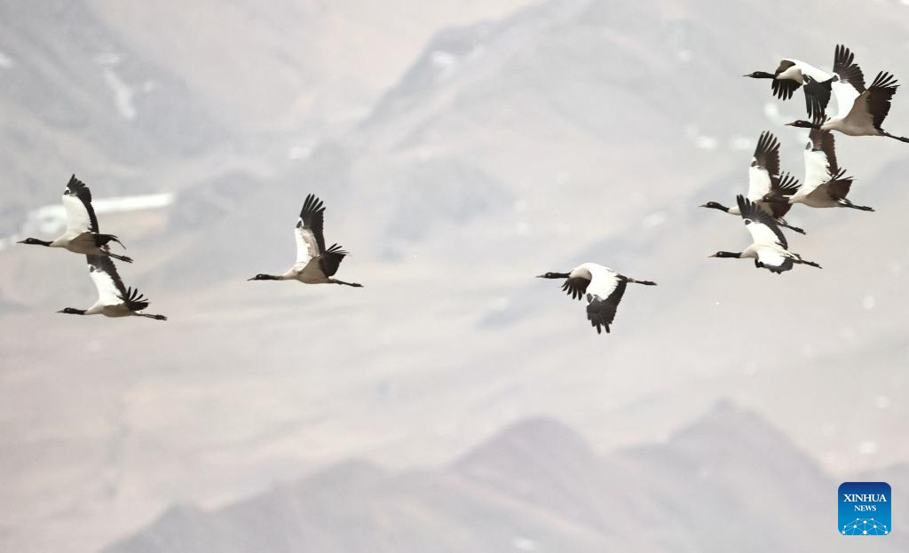 LHASA, 8 marzo, 2025 (Xinhua) -- Grullas de cuello negro vuelan sobre un embalse, en el distrito de Lhunzhub de Lhasa, en la región autónoma de Xizang, en el suroeste de China, el 8 de marzo de 2025. (Xinhua/Tenzin Nyida)