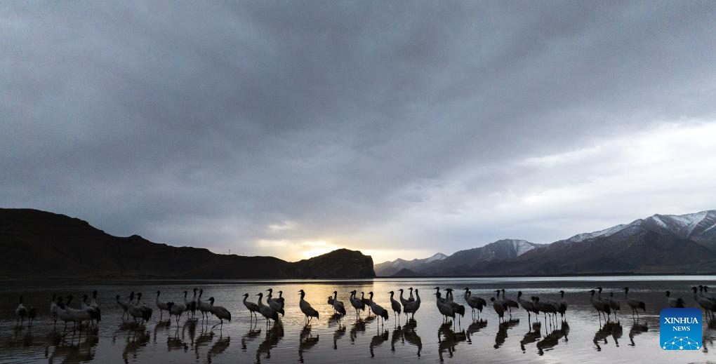 LHASA, 8 marzo, 2025 (Xinhua) -- Una bandada de grullas de cuello negro pasa el invierno en un embalse, en el distrito de Lhunzhub de Lhasa, en la región autónoma de Xizang, en el suroeste de China, el 8 de marzo de 2025. (Xinhua/Tenzin Nyida)