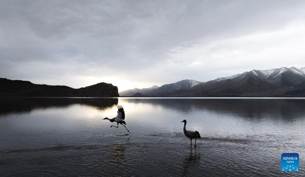 LHASA, 8 marzo, 2025 (Xinhua) -- Imagen tomada con un dron el 8 de marzo de 2025 de grullas de cuello negro en un embalse, en el distrito de Lhunzhub de Lhasa, en la región autónoma de Xizang, en el suroeste de China. (Xinhua/Tenzin Nyida)