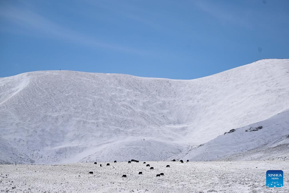 GOLOG, 9 marzo, 2025 (Xinhua) -- Imagen del 8 de marzo de 2025 de yaks vistos en una pradera cubierta por nieve, en la prefectura autónoma tibetana de Golog, en la provincia de Qinghai, en el noroeste de China. (Xinhua/Zhang Long)