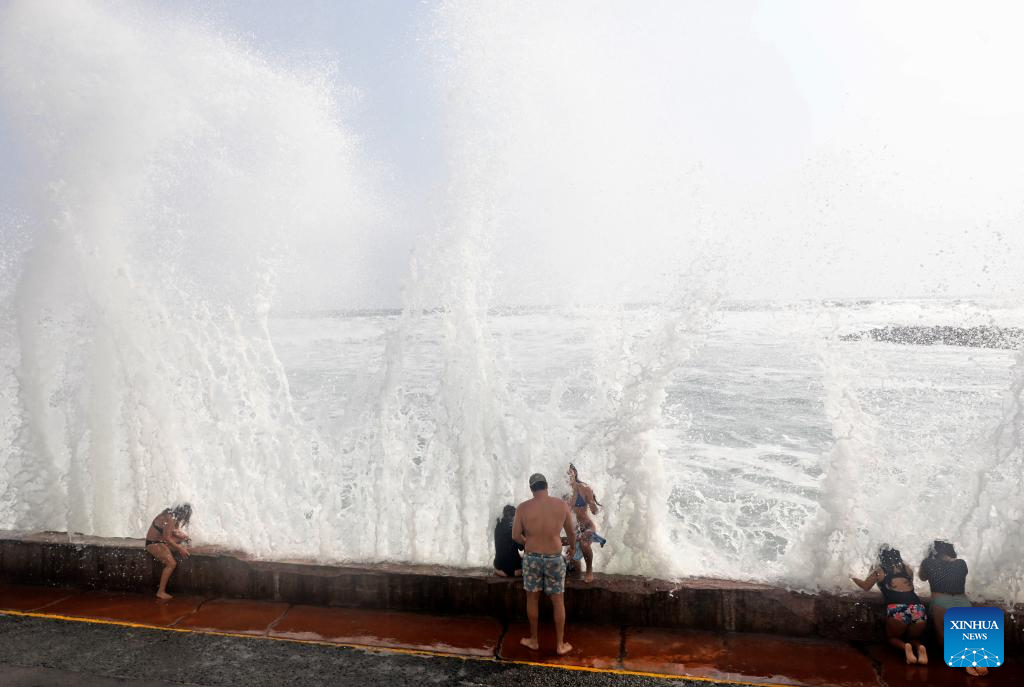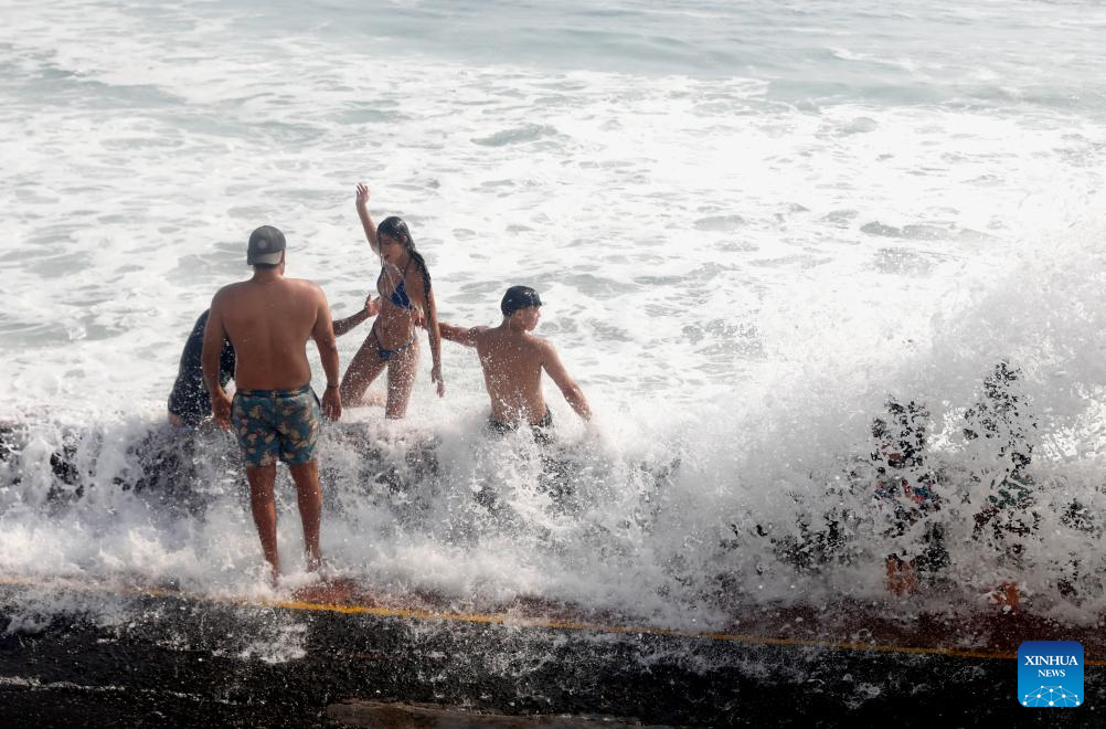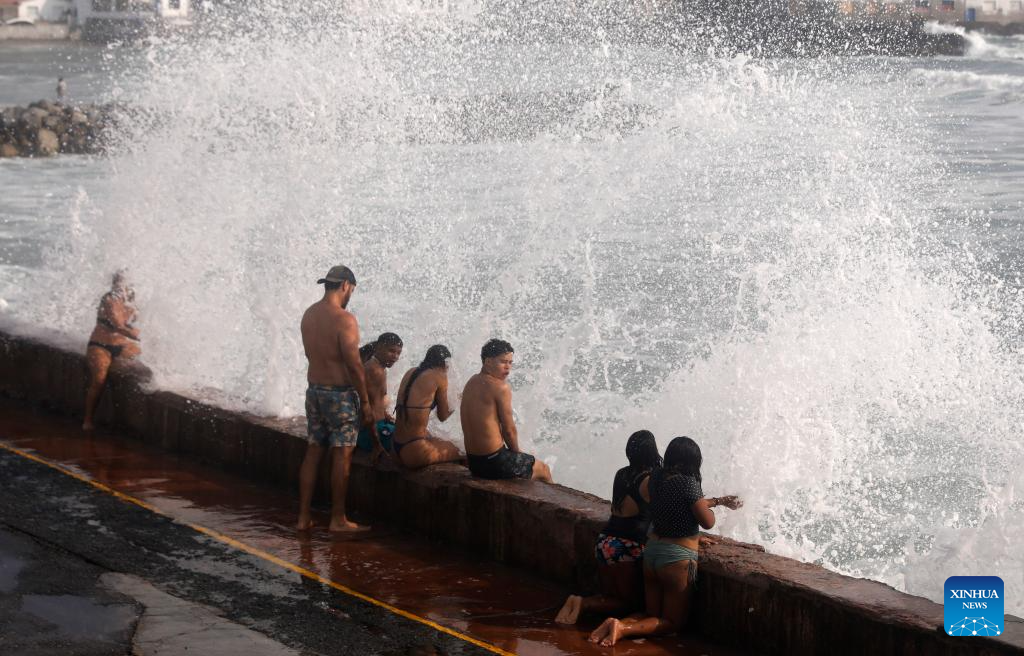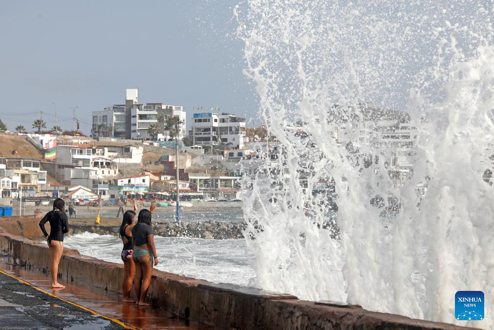 LIMA, 10 abril, 2025 (Xinhua) -- Personas observan las olas producidas por un oleaje anómalo, en la playa San Bartolo, en Lima, Perú, el 10 de abril de 2025. (Xinhua/Mariana Bazo)