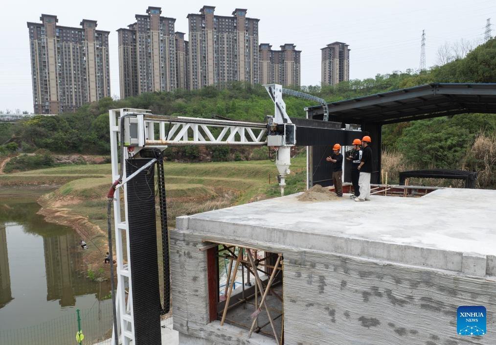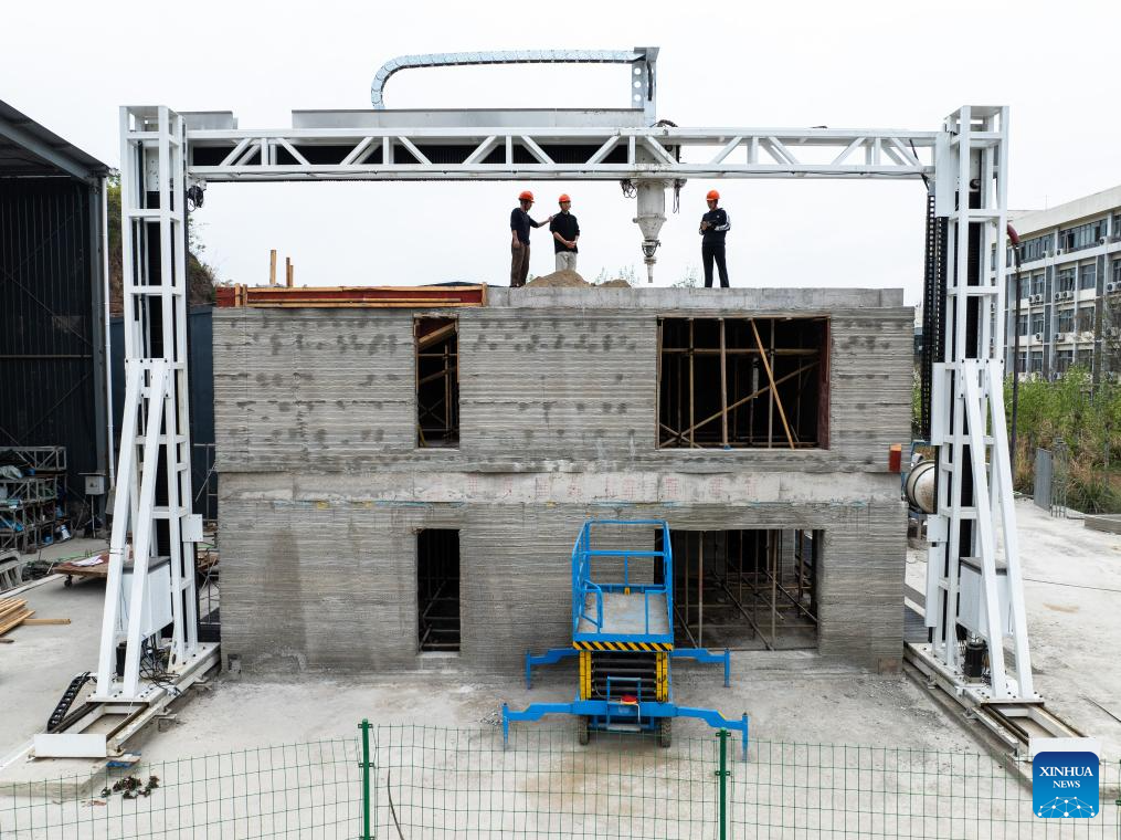 YICHANG, 10 abril, 2025 (Xinhua) -- Imagen del 9 de abril de 2025 de un edificio experimental, en Yichang, en la provincia de Hubei, en el centro de China. Un edificio de 8 metros de altura y dos plantas completó su estructura principal en tan solo 22 días durante un experimento arquitectónico realizado por un equipo de investigación de la Universidad de las Tres Gargantas de China. Una máquina para construcción de viviendas que utiliza tecnología de impresión 3D fue usada en la construcción del edificio experimental de 100 metros cuadrados. (Xinhua/Du Zixuan)
