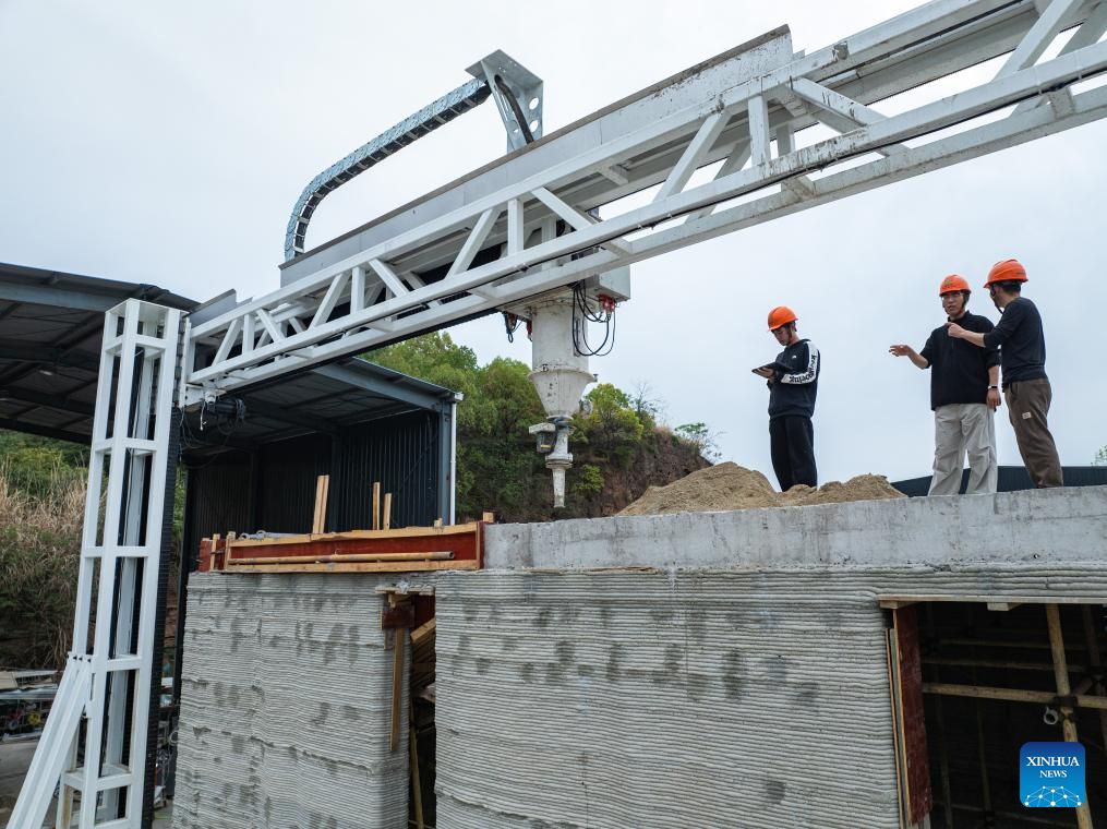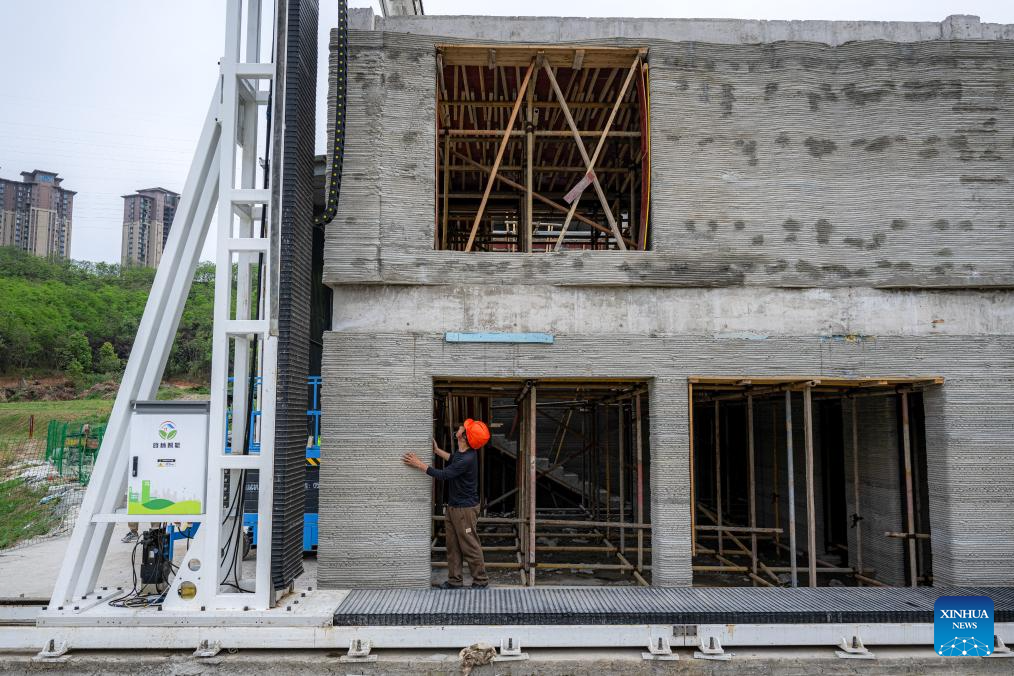 YICHANG, 10 abril, 2025 (Xinhua) -- Imagen del 9 de abril de 2025 de constructores revisando un edificio experimental, en Yichang, en la provincia de Hubei, en el centro de China. Un edificio de 8 metros de altura y dos plantas completó su estructura principal en tan solo 22 días durante un experimento arquitectónico realizado por un equipo de investigación de la Universidad de las Tres Gargantas de China. Una máquina para construcción de viviendas que utiliza tecnología de impresión 3D fue usada en la construcción del edificio experimental de 100 metros cuadrados. (Xinhua/Xiao Yijiu)