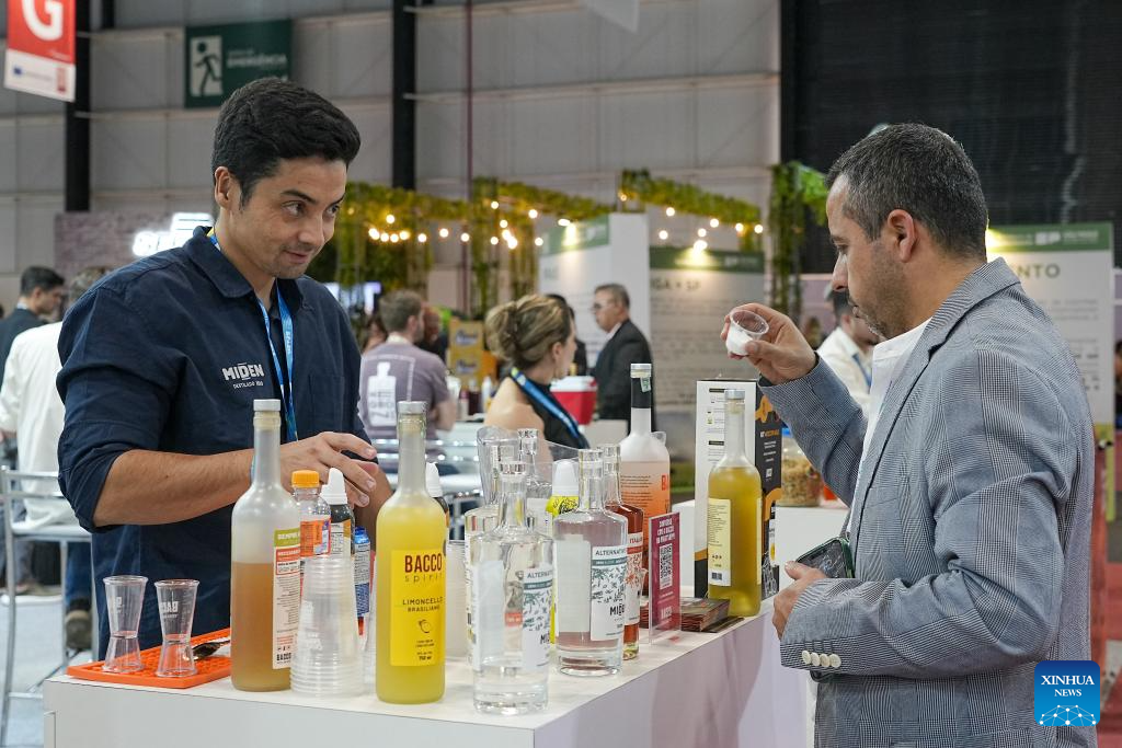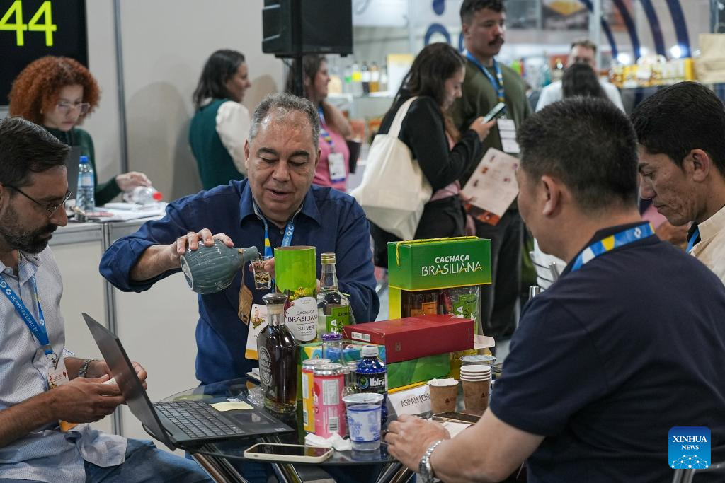 SAO PAULO, 10 abril, 2025 (Xinhua) -- Imagen del 9 de abril de 2025 de un vendedor interactuando con un visitante en la feria internacional de alimentos y bebidas "Anuga Select Brasil", en Sao Paulo, Brasil. (Xinhua/Paulo Lopes)