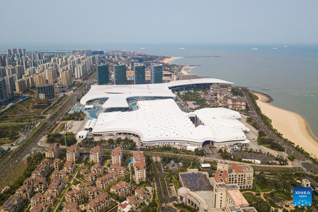 HAIKOU, 11 abril, 2025 (Xinhua) -- Imagen del 10 de abril de 2025 del Centro Internacional de Convenciones y Exposiciones de Hainan, sede principal de la próxima V Exposición Internacional de Productos de Consumo de China (CICPE, por sus siglas en inglés), en Haikou, capital de la provincia de Hainan, en el sur de China. La V CICPE, que presenta ocho salas de exposición, esta agendada del 13 al 18 de abril aquí. La exposición, una plataforma clave para el comercio mundial y tendencias de consumo, ha atraído la participación de más de 4,100 marcas de 71 países y regiones. (Xinhua/Pu Xiaoxu)
