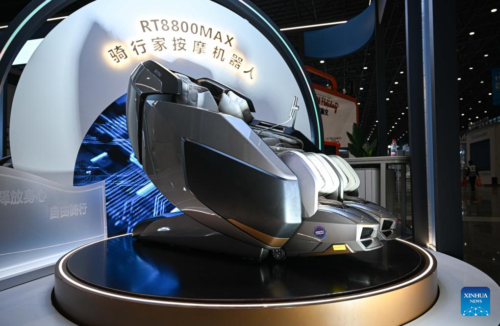 HAIKOU, 11 abril, 2025 (Xinhua) -- Imagen del 10 de abril de 2025 de un robot masajeador en el Centro Internacional de Convenciones y Exposiciones de Hainan, sede principal de la próxima V Exposición Internacional de Productos de Consumo de China (CICPE, por sus siglas en inglés), en Haikou, capital de la provincia de Hainan, en el sur de China. La V CICPE, que presenta ocho salas de exposición, esta agendada del 13 al 18 de abril aquí. La exposición, una plataforma clave para el comercio mundial y tendencias de consumo, ha atraído la participación de más de 4,100 marcas de 71 países y regiones. (Xinhua/Pu Xiaoxu)