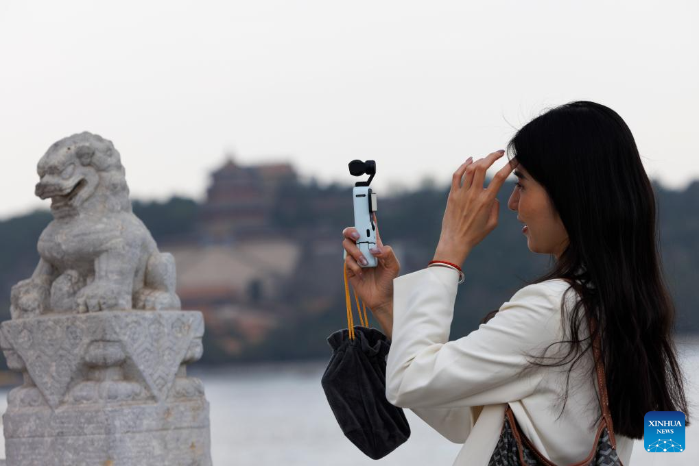 BEIJING, 11 abril, 2025 (Xinhua) -- Imagen del 9 de abril de 2025 de una visitante grabando videos en el Puente de Diecisiete Arcos en el Palacio de Verano, en Beijing, capital de China. En la primavera de 2025, los entusiastas de la fotografía se lanzaron a capturar paisajes primaverales con sus teléfonos inteligentes y cámaras, creando un fenómeno primaveral distintivo. La participación pública en la fotografía ha experimentado un crecimiento notable en los últimos años, impulsada por los avances en la fotografía con teléfonos inteligentes y el uso generalizado de las redes sociales. Esta "locura fotográfica" ha estimulado simultáneamente el turismo y la economía primaveral. (Xinhua/Jin Liwang)