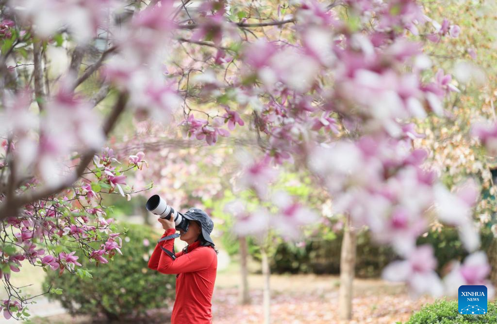 BEIJING, 11 abril, 2025 (Xinhua) -- Imagen del 8 de abril de 2025 de una entusiasta de la fotografía tomando fotografías de flores de magnolia en un parque, en el distrito de Haidian de Beijing, capital de China. En la primavera de 2025, los entusiastas de la fotografía se lanzaron a capturar paisajes primaverales con sus teléfonos inteligentes y cámaras, creando un fenómeno primaveral distintivo. La participación pública en la fotografía ha experimentado un crecimiento notable en los últimos años, impulsada por los avances en la fotografía con teléfonos inteligentes y el uso generalizado de las redes sociales. Esta "locura fotográfica" ha estimulado simultáneamente el turismo y la economía primaveral. (Xinhua/Yin Gang)