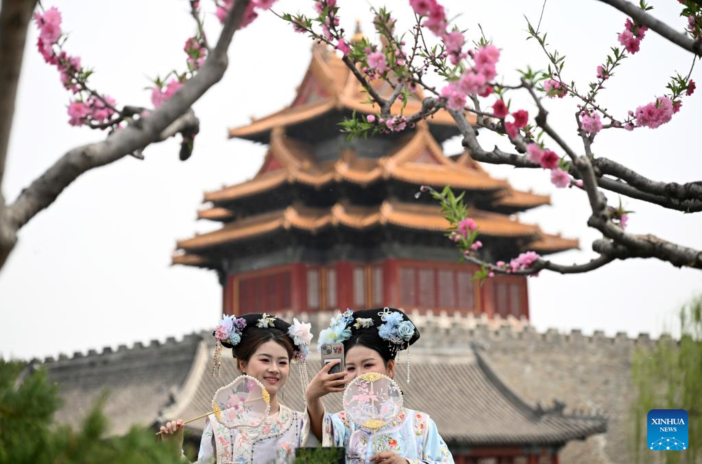 BEIJING, 11 abril, 2025 (Xinhua) -- Imagen del 8 de abril de 2025 de visitantes con trajes tradicionales tomándose fotografías cerca de una torre de la Ciudad Prohibida, en Beijing, capital de China. En la primavera de 2025, los entusiastas de la fotografía se lanzaron a capturar paisajes primaverales con sus teléfonos inteligentes y cámaras, creando un fenómeno primaveral distintivo. La participación pública en la fotografía ha experimentado un crecimiento notable en los últimos años, impulsada por los avances en la fotografía con teléfonos inteligentes y el uso generalizado de las redes sociales. Esta "locura fotográfica" ha estimulado simultáneamente el turismo y la economía primaveral. (Xinhua/Jin Liangkuai)