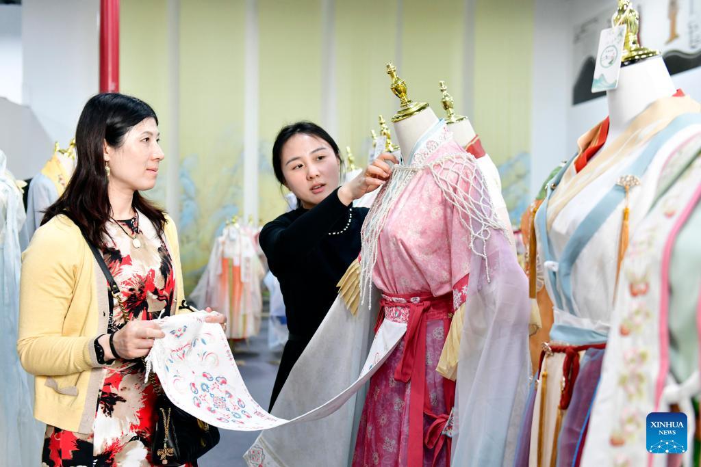 HEZE, 11 abril, 2025 (Xinhua) -- Imagen del 10 de abril de 2025 de una trabajadora presentando un Hanfu a una clienta en una base de Hanfu, en el distrito de Caoxian, en la provincia de Shandong, en el este de China. El distrito de Caoxian ha desarrollado una completa cadena industrial de Hanfu en los últimos años. Hoy en día, existen más de 2.700 empresas relacionadas con el Hanfu en el distrito. Las ventas totales del Hanfu en Caoxian excedieron los 12 billones de yuanes (aproximadamente 1,6 billones de dólares estadounidenses) en 2024. (Xinhua/Guo Xulei)