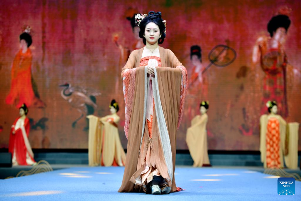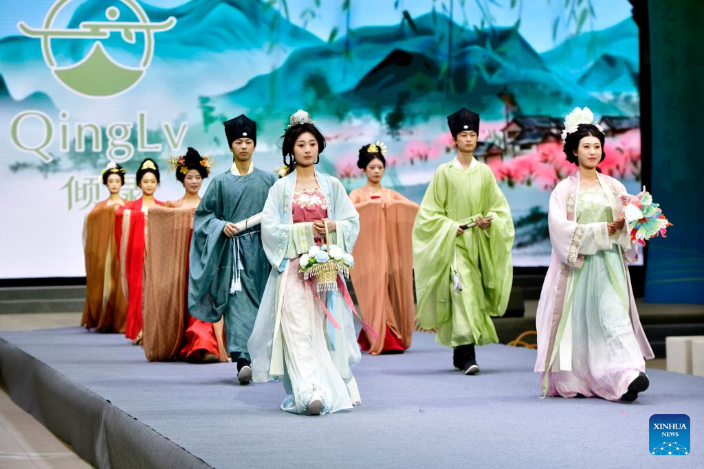 HEZE, 11 abril, 2025 (Xinhua) -- Imagen del 10 de abril de 2025 de modelos portando Hanfu en el escenario durante un evento de lanzamiento de Hanfu, en el distrito de Caoxian, en la provincia de Shandong, en el este de China. El distrito de Caoxian ha desarrollado una completa cadena industrial de Hanfu en los últimos años. Hoy en día, existen más de 2.700 empresas relacionadas con el Hanfu en el distrito. Las ventas totales del Hanfu en Caoxian excedieron los 12 billones de yuanes (aproximadamente 1,6 billones de dólares estadounidenses) en 2024. (Xinhua/Guo Xulei)