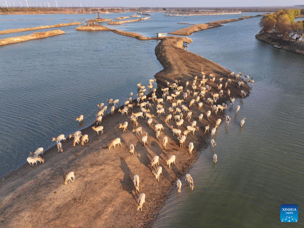YANCHENG, 11 abril, 2025 (Xinhua) -- Vista aérea tomada con un dron el 21 de diciembre de 2024 de ciervos milu, en Yancheng, en la provincia de Jiangsu, en el este de China. Yancheng, situada en la parte central del litoral de la provincia de Jiangsu, debe su nombre al significado de "ciudad rodeada de campos de sal". En los últimos años, Yancheng se ha esforzado por dar forma a una ciudad verde y habitable mediante diversos esfuerzos. (Xinhua/Ji Chunpeng)