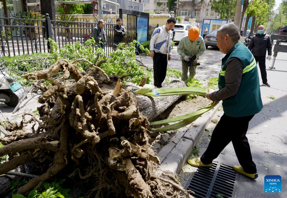 BEIJING, 12 abril, 2025 (Xinhua) -- Trabajadores laboran para retirar los árboles caídos y arrancados de raíz por los fuertes vientos, en Zhengzhou, en la provincia de Henan, en el centro de China, el 12 de abril de 2025. Muchas partes del norte de China están experimentando vientos huracanados y descensos de temperatura el sábado. (Xinhua/Li Jianan)