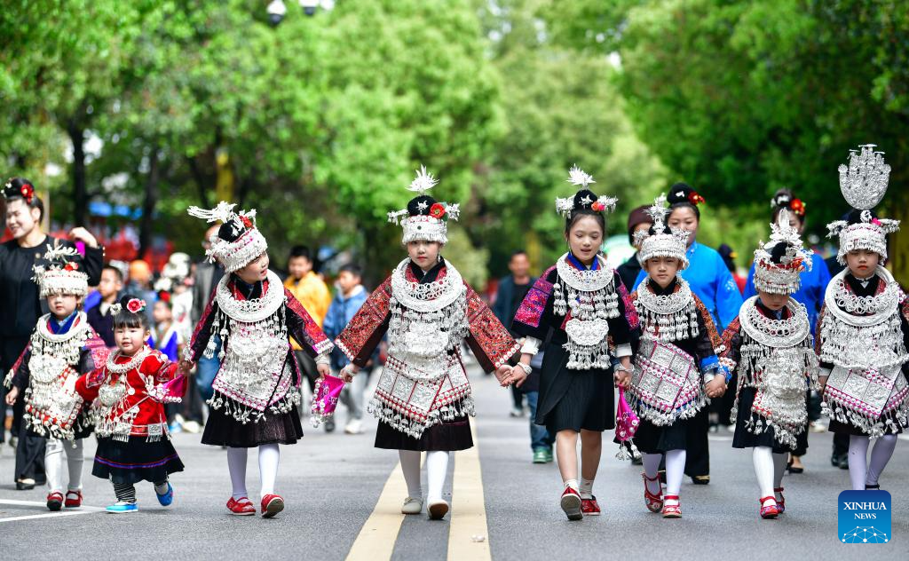 TAIJIANG, 12 abril, 2025 (Xinhua) -- Niñas portan trajes étnicos mientras asisten a una actividad para celebrar el Festival de las Hermanas Miao, en el distrito de Taijiang, en la provincia de Guizhou, en el suroeste de China, el 12 de abril de 2025. Reconocido como patrimonio cultural inmaterial nacional, el Festival de las Hermanas Miao se celebró aquí el sábado. (Xinhua/Yang Wenbin)