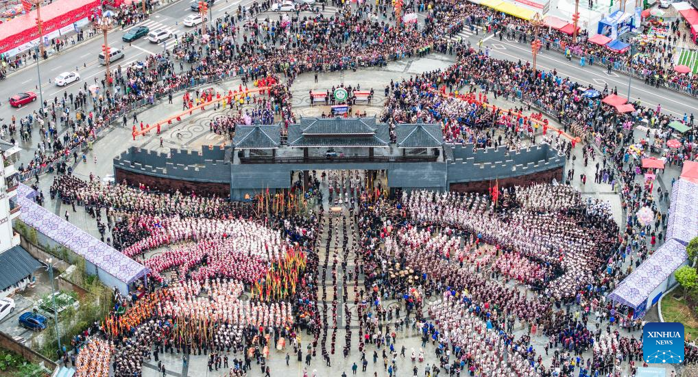 TAIJIANG, 12 abril, 2025 (Xinhua) -- Vista aérea tomada con un dron el 12 de abril de 2025 de personas asistiendo a una actividad para celebrar el Festival de las Hermanas Miao, en el distrito de Taijiang, en la provincia de Guizhou, en el suroeste de China. Reconocido como patrimonio cultural inmaterial nacional, el Festival de las Hermanas Miao se celebró aquí el sábado. (Xinhua/Tao Liang)