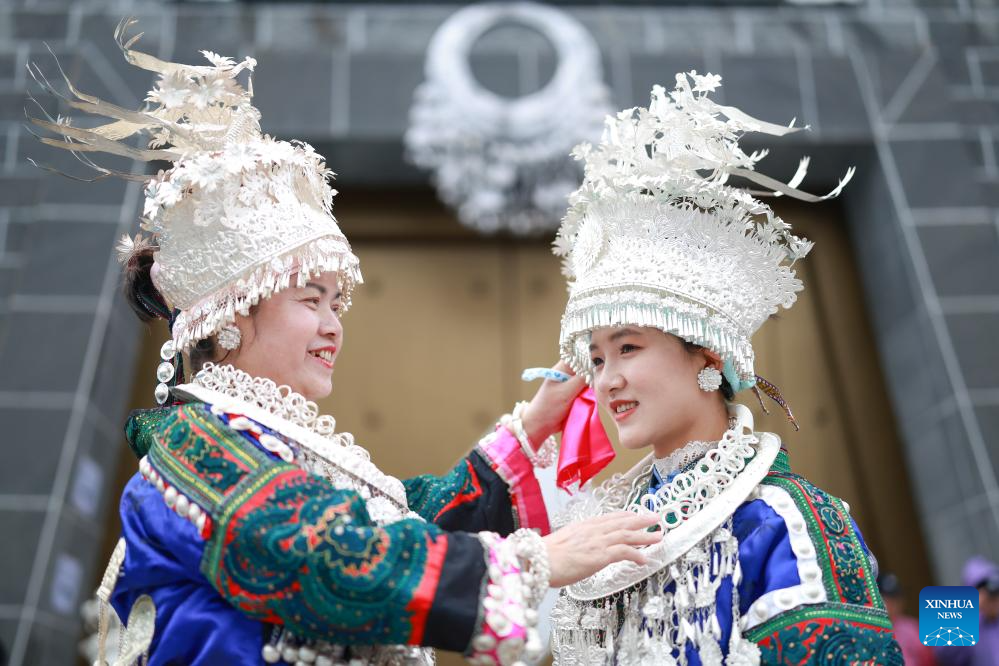 TAIJIANG, 12 abril, 2025 (Xinhua) -- Una mujer porta un traje étnico mientras ayuda a su compañera artista a ajustar los adornos de la cabeza durante una actividad para celebrar el Festival de las Hermanas Miao, en el distrito de Taijiang, en la provincia de Guizhou, en el suroeste de China, el 12 de abril de 2025. Reconocido como patrimonio cultural inmaterial nacional, el Festival de las Hermanas Miao se celebró aquí el sábado. (Xinhua/Liu Xu)