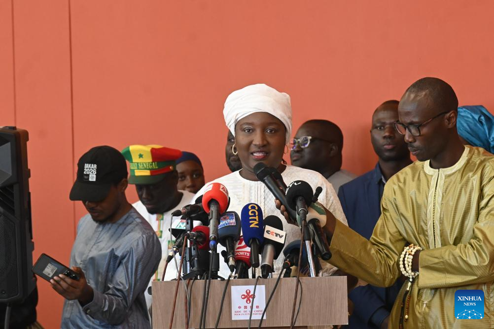 (250412) -- DAKAR, 12 abril, 2025 (Xinhua) -- Imagen del 11 de abril de 2025 de Khady Diene Gaye, ministra de Juventud, Deportes y Cultura de Senegal, hablando en la ceremonia de entrega de la renovación de cuatro estadios con ayuda china, en Dakar, Senegal. La ceremonia de entrega de la renovación de cuatro estadios en Senegal con ayuda china se celebró el viernes en el Estadio Léopold Sédar Senghor en Dakar, capital de Senegal. Este proyecto, una de las mayores iniciativas de ayuda china en Senegal, comenzó en 2022 e incluyó la renovación y modernización del Estadio Senghor en Dakar, así como de los estadios locales de Kaolack, Diourbel y Ziguinchor. (Xinhua/Si Yuan)