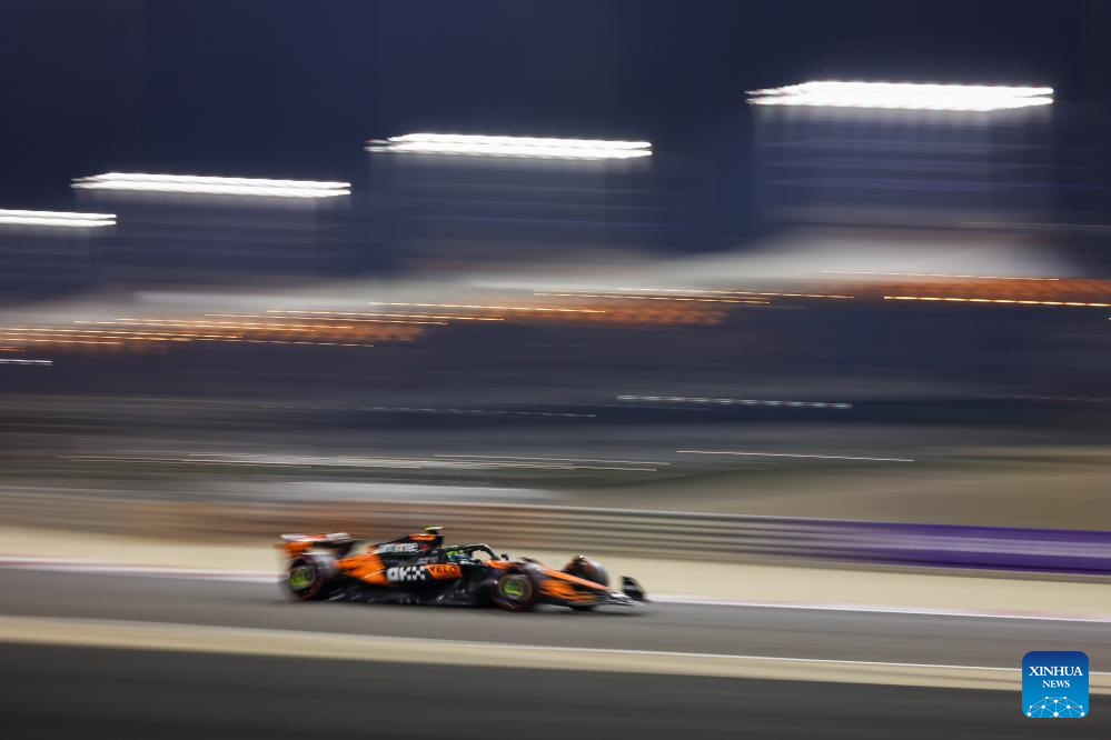 SAKHIR, 12 abril, 2025 (Xinhua) -- Imagen del 11 de abril de 2025 del piloto británico de la escudería McLaren, Lando Norris, conduciendo durante la segunda sesión de prácticas libres del Gran Premio de Bahréin de Fórmula Uno en el Circuito Internacional de Bahréin, en Sakhir, Bahréin. (Xinhua/Qian Jun)